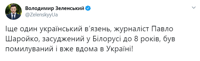 "Еще один украинский узник, журналист Павел Шаройко, осужденный в Беларуси на 8 лет, был помилован и уже дома в Украине!" - написал Зеленский в своем микроблоге в Тwitter.