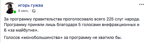 Голосов "монобольшинства" за программу не хватило бы", - написал Гужва в Facebook.