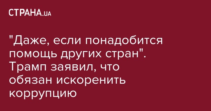 Президент США Дональд Трамп сделал очередное заявление о борьбе с коррупцией. На этот раз он заявил, что обязан прекратить коррупцию, даже если для этого придется просить помощи других стран. Об этом он заявилв своем микроблоге в Тwitter.