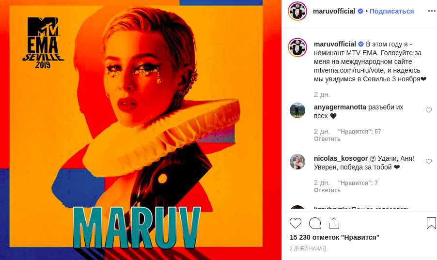 Победительница национального отбора на Евровидение-2019 певица MARUV уже претендует на звание лучшей артистки России в конкурсе ЕМА 2019, который проводит MTV, выбирая лучших артистов в нескольких странах. Об этом говорится на сайте премии.