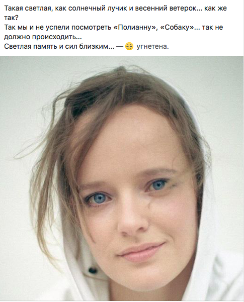 "5 октября ушла из жизни актриса Марина Куклина – светлая, всегда улыбающаяся, искренняя, открытая девушка. Это огромная потеря для коллег Марины, ее близких и родных. В нашей памяти она навсегда останется лучом света. Наша неповторимая, нежная, сияющая Поллианна оставила частичку своего неисчерпаемого оптимизма в сердце каждого, с кем она делилась своим теплом, любовью и незабываемой улыбкой.