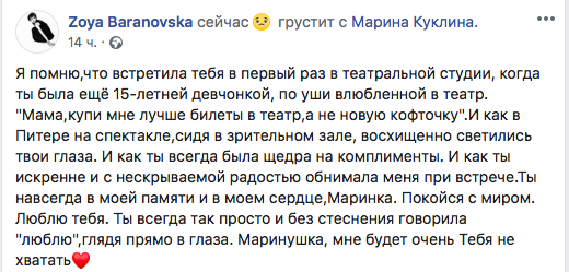 "Я помню, что встретила тебя в первый раз в театральной студии, когда ты была еще 15-летней девчонкой, по уши влюбленной в театр. "Мама, купи мне лучше билеты в театр, а не новую кофточку". И как в Питере на спектакле, в зрительном зале, восхищенно светились твои глаза. И как ты всегда была щедра на комплименты. И как ты искренне и с нескрываемой радостью обнимала меня при встрече. Ты навсегда в моей памяти и в моем сердце, Маринка. Покойся с миром. Люблю тебя. Ты всегда так просто и без стеснения говорила "люблю", глядя прямо в глаза. Маринушка, мне будет очень Тебя не хватать", – написала в Facebook Зоя Барановская и прикрепила черно-белое фото Марины Куклиной, которая бежит на природе.
