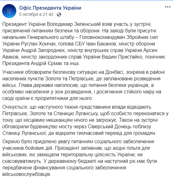 "Президент заверил, что никакие льготы для военных, защищавших территориальную целостность Украины, не будут отменять. В государственном бюджете на следующий год должно быть предусмотрено финансирование социального обеспечения военнослужащих", - говорится в сообщении ОП.