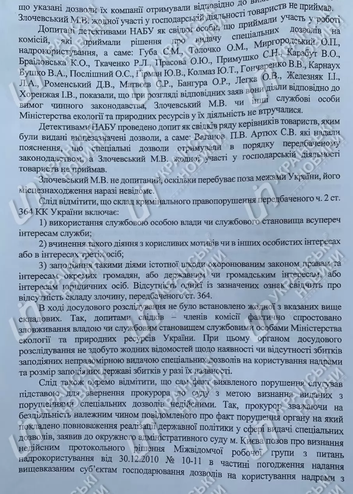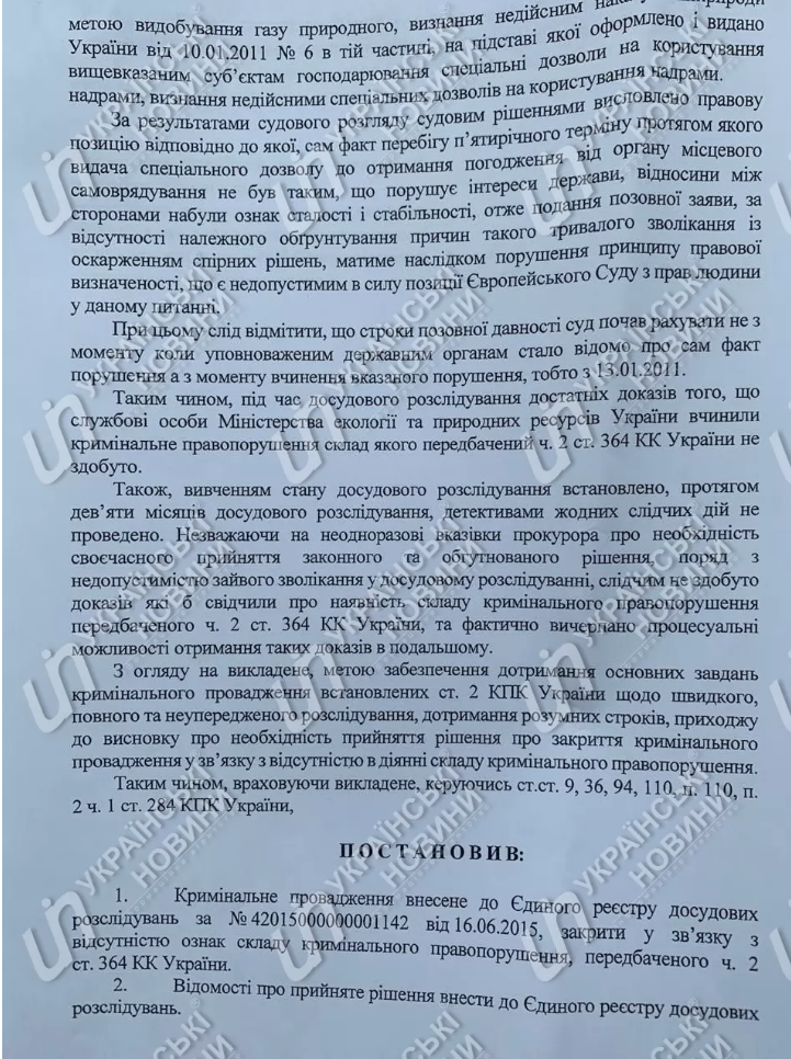 В постановлении о закрытии уголовного производства уточняется, что дело расследовалось с июня 2015 года по статье 364 Уголовного кодекса (злоупотребление властью или служебным положением) Уголовного кодекса. В ходе досудебного расследования были допрошены в качестве свидетелей руководители предприятий, которым были выданы разрешения на пользование недрами,а также члены комиссий, которые принимали решения о выдаче спецразрешений.