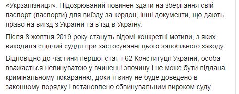 Также экс-нардепу необходимо воздерживаться от общения с людьми, которые работали или работают с 2015 года в филиале "Центр обеспечения производства" АО "Укрзализныця", АО "Укрзализныця" и Государственной администрации железнодорожного транспорта Украины.