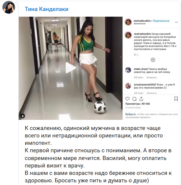 Новый скандал начался после того, как Василий Уткин выложил в сети видео с девушкой-фристайлером в форме сборной Колумбии, отметив на нем Канделаки и сопроводив комментарием: "Когда красивой немолодой женщине из Колумбии нечего делать, она все равно радует глаз и сердце, а в России приходится возглавлять "Матч ТВ" и пустословить в Telegram".
