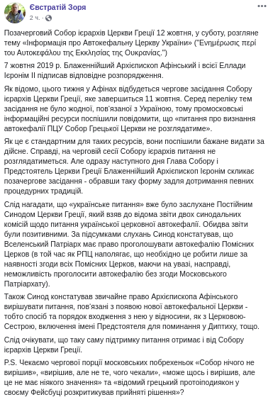 "Среди перечня тем заседания не было ни одной, связанной с Украиной, поэтому промосковские информационные ресурсы поспешили сообщить, что "вопрос о признании автокефалии ПЦУ Собор Греческой церкви не будет рассматривать", - пояснил Евстратий Зоря.