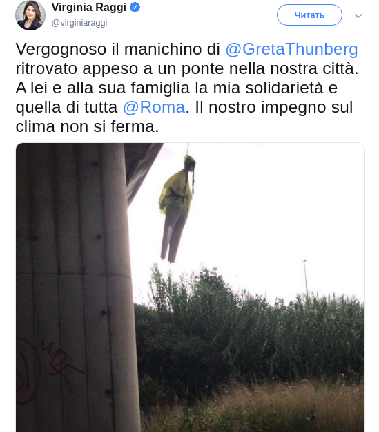 Мэр Рима Вирджиния Рагги написала в Twitter, что она солидарна с 16-летней шведской девушкой и ее семьей, назвав инцидент "позорным".
