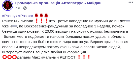 "Уже четвертое нападение на мужчин до 60 лет, на Воскресенке-Радужная за последние 3 недели, почерк сумасшедшего одинаковый. До 20:00 выходит на охоту с ножом, беспричинно в темном месте подбегает и наносит большим ножом удары в область спины, но теперь он бьет в шею и лицо как на ул. Вершигоры. Человек опасный и непредсказуемый", - говорится в сообщении.