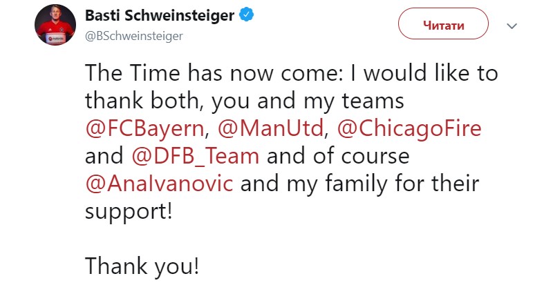 "Время пришло. Хочу поблагодарить всех вас и мои команды: "Баварию", "Манчестер Юнайтед", "Чикаго Файр" и сборную Германии. И, конечно, Анну Иванович и свою семью за поддержку. Спасибо", - написал футболист.