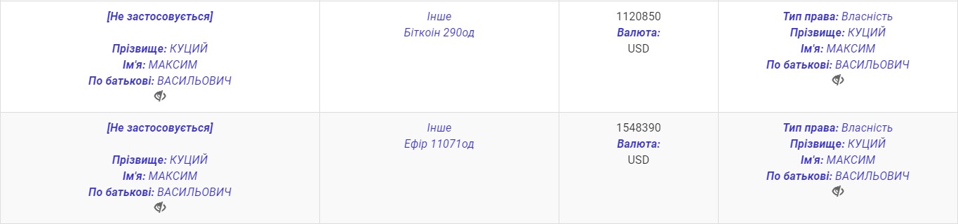 Также семья задекларировала трое наручных часов торговых марок Parmigiani Fleurier и Rolex и крупную суммы наличными — 235 тысяч долларов США. В банке Куцый хранит 2300 евро и 246284 грн. Еще 2,7 млн долларов у него в криптовалютах биткойн и этериум.