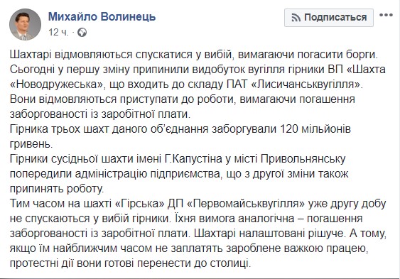 "Горняки соседней шахты имени Капустина в городе Привольнянске предупредили администрацию предприятия, со второй смены также прекратят работу. Между тем на шахте "Горная" ГП "Первомайскуголь" уже вторые сутки не спускаются в забой горняки. Их требование аналогичное - погашение задолженности по заработной плате. Шахтеры настроены решительно. А потому, если им в ближайшее время не заплатят заработанное тяжелым трудом, протестные действия они готовы перенести в столицу", - написал Волынец.