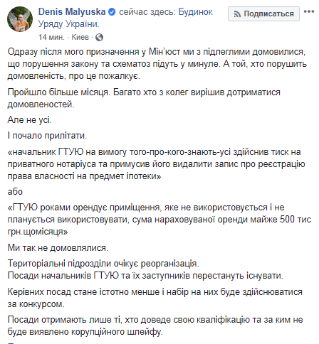 "Многие из коллег решили соблюсти договоренности. Но не все. И начало прилетать. "Начальник ГТУЮ по требованию того-о-ком-знают-все оказал давление на частного нотариуса и заставил его удалить запись о регистрации права собственности на предмет ипотеки" или "ГТУЮ годами арендует помещение, которое не используется и не планируется использовать, сумма начисляемая за аренду почти 500 тысяч грн ежемесячно. Мы так не договаривались", - написал Малюська.