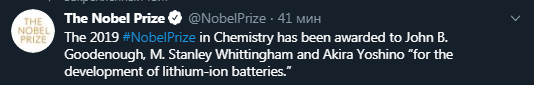 Премию присудили Джону Б Гуденафу, М. Стэнли Виттинхэму и Акире Ёсино за изобретение литий-ионных батарей. Профессор Гуденаф стал самым пожилым лауреатом Нобелевской премии независимо от дисциплины, ему 97 лет.