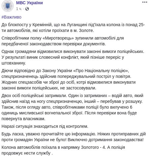 Ранее "Страна" сообщала, что опубликовано видео, как силовики стреляют в воздух, чтобы не дать националистам и ветеранам АТО прорваться через блокпост в Золотое.