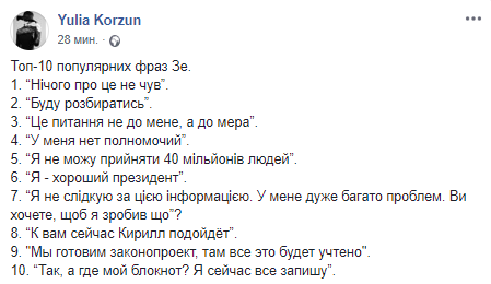 Журналист "Страны" Юлия Корзун собрала топ-10 наиболее популярных фраз, которые произносил президент Украины Владимир Зеленский во время пресс-марафона в Киеве, 10 октября. Об этом она сообщила на своей странице в социальной сети Facebook.