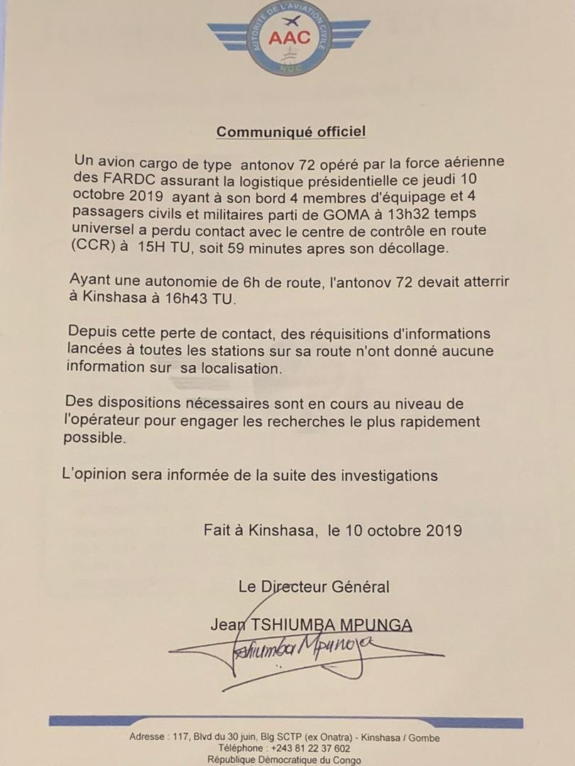 Известно, что самолет вылетел из аэропорта Гомы в четверг, 10 октября, в 13:32 по местному времени (15:32 по Киеву) и направился в Киншасу. Пилоты перестали выходить на связь с центром управления примерно спустя час. В районе предполагаемого исчезновения начата поисково-спасательная операция.
