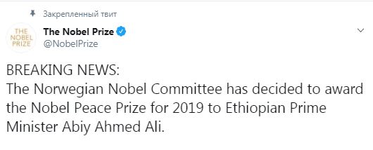 Сегодня, 11 октября, в столице Норвегии Осло Нобелевский комитет объявил лауреата Нобелевской премии мира 2019 года. Им стал премьер-министр Эфиопии Абий Ахмед Али. Об этом сообщает премия в своем Twitter.