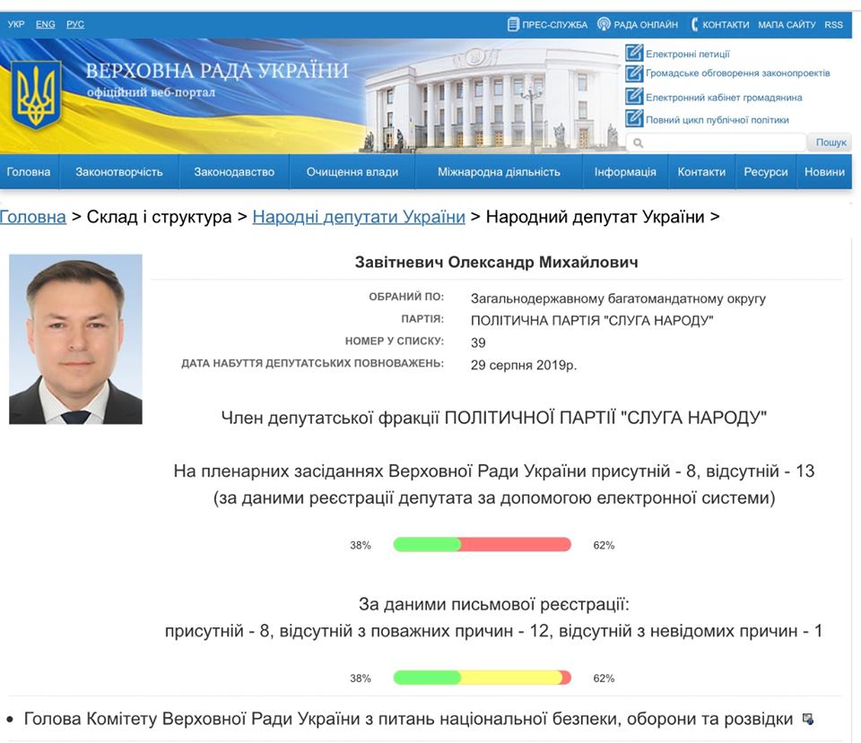 Также Завитневич опубликовал статистику своих посещений заседаний Верховной Рады. Из нее видно, что он присутствовал на 8 заседаниях, а отсутствовал на 13. Причем 12 раз он не явился на работу по уважительным причинам.