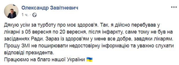 "Да, я действительно находился в больнице с 05 сентября по 20 сентября, после инфаркта, поэтому не был на заседаниях Совета. Сейчас со здоровьем у меня все хорошо благодаря врачам", - написал депутат.
