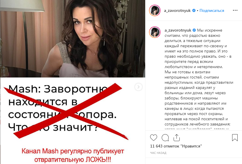 "От лица всей нашей семьи хотим выразить огромную благодарность друзьям, которые проявили инициативу по созданию аккаунта против лжи и травли в СМИ! Но, к сожалению, Instagram - аккаунт @podderzhka_azavorotnyuk заблокировали... Увы, восстановить аккаунт пока не удаётся. Мы приняли решение, что будем продолжать прямо здесь", - сказано в первом сообщении.