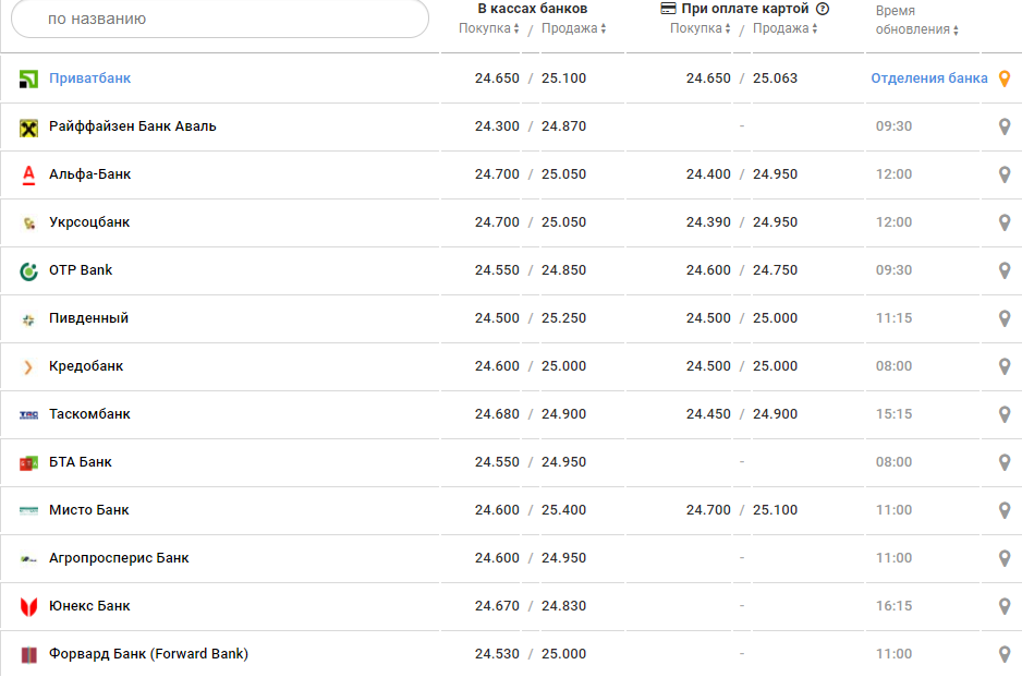 В банках курс доллара с утра был такой: покупка от 24 до 24,6 грн, продажа - от 24,7 до 25,05 грн.