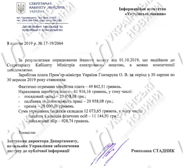 Премьер-министр Украины Алексей Гончарук получил зарплату в 62 тысячи гривен. Это в три раза больше, чем должностной оклад. Об этом говорится в ответе секретариата Кабинета Министров на запрос Українських Новин.