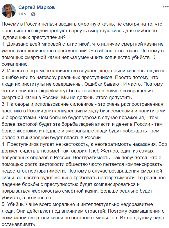 А вот российский политолог Сергей Марков привел основной набор аргументов со стороны противников смертной казни:
