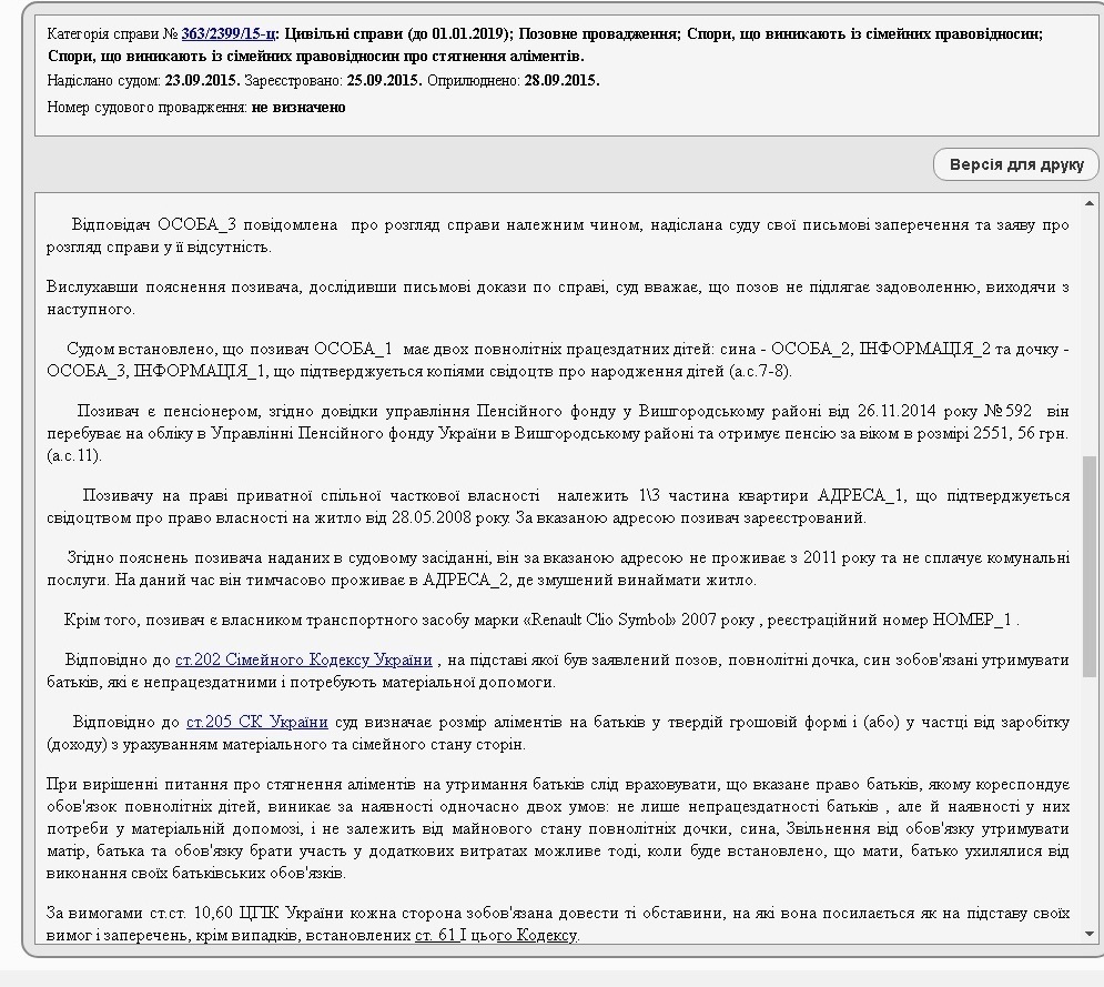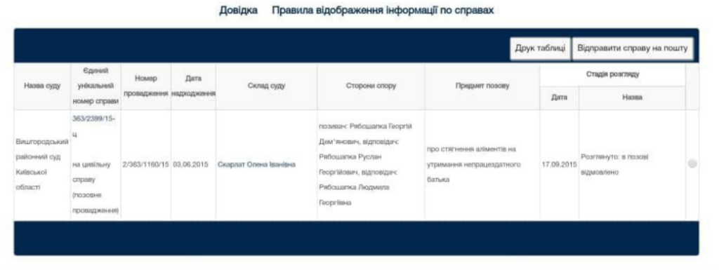 Однако судья Елена Скарлат отказала в удовлетворении исковых требований. Основаниями для отказа, как следует из материалов дела, является то, что Георгий Рябошапка получает пенсию по возрасту, которая на тот момент составляла 2551,56 грн и превышала установленный на тот момент законодательством прожиточный минимум (1176 грн), а также на правах совместной собственности отцу, согласно информации суда, принадлежала 1/3 квартиры. Кроме того, он указан как владелец автомобиля.