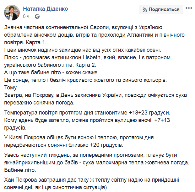 Праздничный день 14 октября в Украине будет сухим и очень теплым, причем бабье лето побалует украинцев и после праздника. Об этом на Facebook пишет синоптик Наталья Диденко.