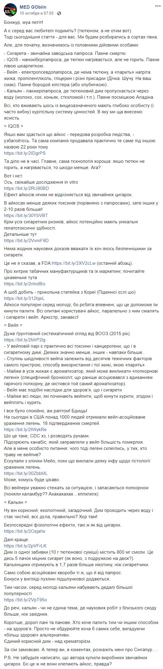 Чем опасны вейпы, электронные сигареты и кальяны для здоровья, научно и остроумно рассказал MED GOblin. Обязательно к прочтению всем, кто курит, и тем, кто нет. Чтобы вообще никогда не захотелось".