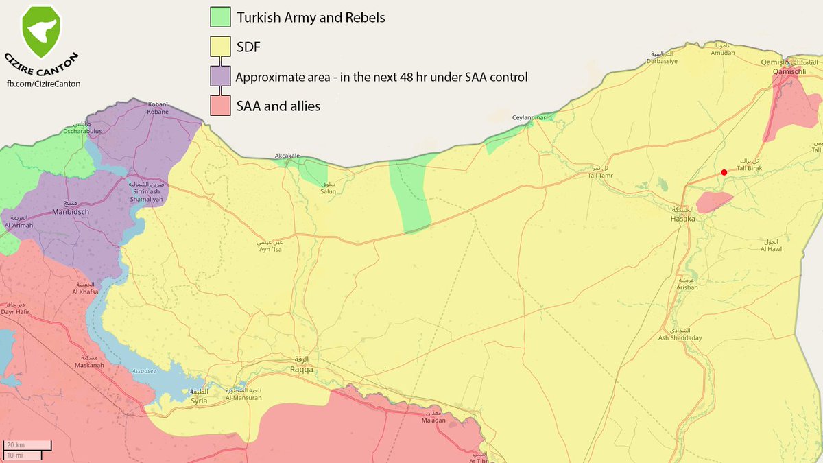 Сирийские источники указывают, что в течение 48 часов сирийская армия должна занять Манбидж и Кобани (на карте район окрашен в сиреневые цвета).
