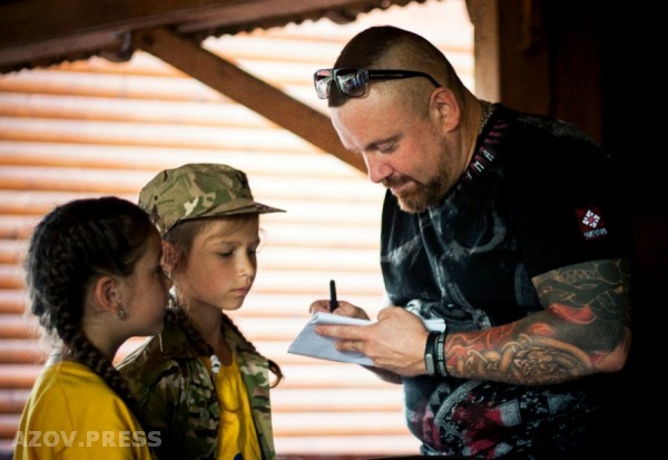"Сокира Перуна" близка также к "Азову" и "Нацкорпусу". Ее солист "Белодуб" посещал детский лагерь "Азовец" и раздавал там автографы.