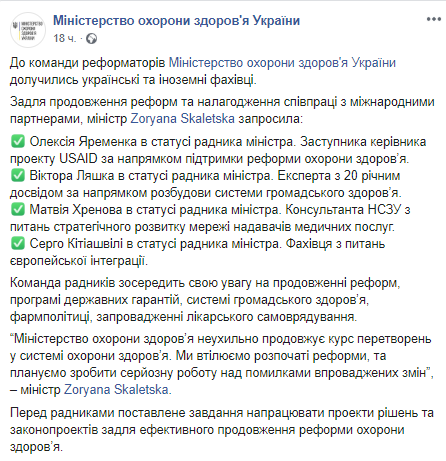 По словам Скалецкой, министерство "продолжает курс преобразований в системе здравоохранения, воплощает начатые реформы и планирует сделать серьезную работу над ошибками внедренных изменений".