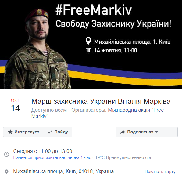 В понедельник, 14 октября, в 11:00 на Михайловской площади в Киеве началась акция за справедливый суд для Виталия Маркива, находящегося в заключении в Италии уже третий год и недавно осужденного на четверть века в тюрьме за убийство итальянского журналиста в зоне АТО.