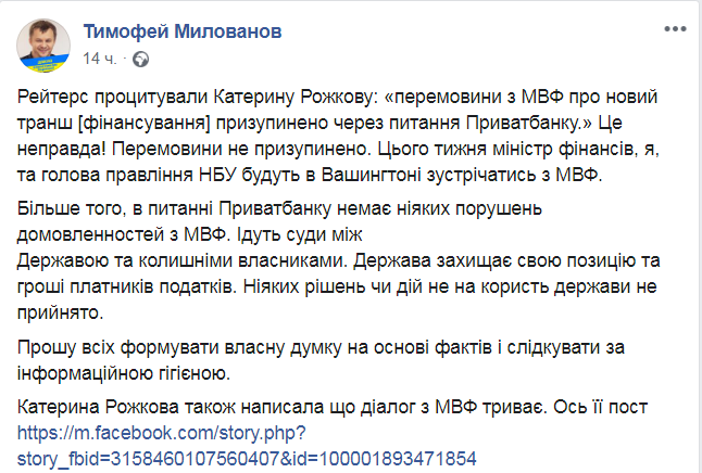 "Reuters процитировали Екатерину Рожкову: "Переговоры с МВФ о новом транше приостановлены из-за вопроса Приватбанка". Это неправда! Переговоры не приостановлены. На этой неделе министр финансов, я и председатель правления НБУ будут в Вашингтоне встречаться с МВФ", - сказано в посте Милованова.