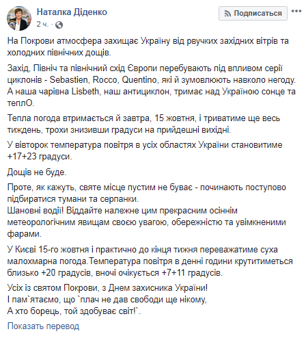 "На Покров атмосфера защищает Украину от порывистых западных ветров и холодных северных дождей. Запад, север и северо-восток Европы находятся под влиянием серии циклонов - Sebastien, Rocco, Quentino, которые и обусловливают вокруг непогоду. А наша волшебная Lisbeth, наш антициклон, держит над Украиной солнце и тепло", - написала Диденко.