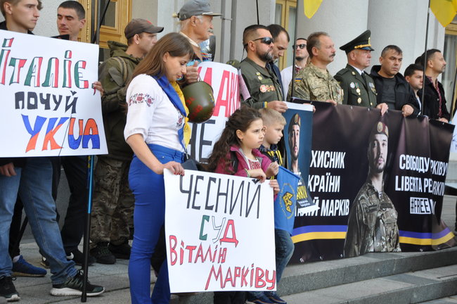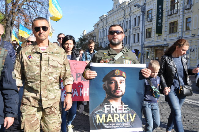 В поддержку Виталия Маркива выступила его жена Диана, которая возглавляла колонну. Также присутствовал и выступал украинский режиссер Олег Сенцов, освобожденный из заключения в РФ в рамках обмена удерживаемыми лицами. Супруга Маркива заявила, что не верит в то, что он причастен к убийству, а дело против него - это обвинение в сторону всей украинской армии.