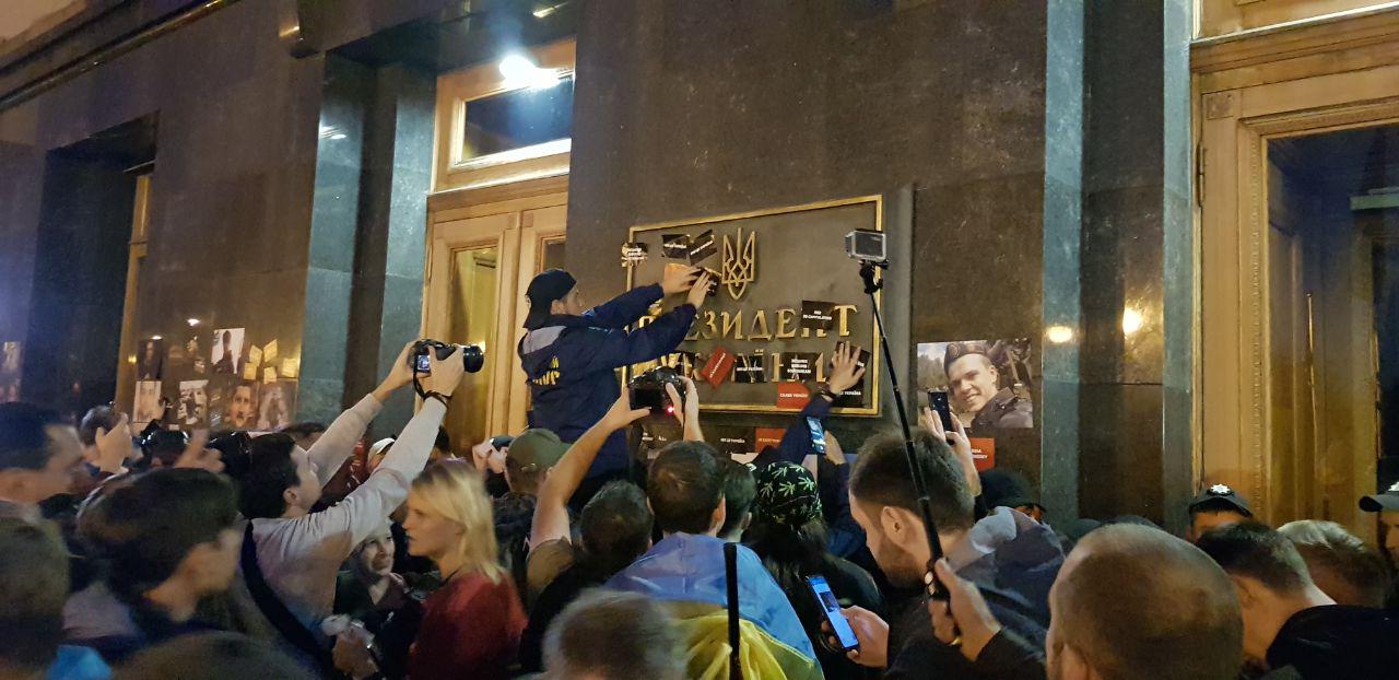 18:51 Активисты пришли к Офису президента, который сегодня уехал на Донбасс, и заклеивают его надписями "Слава Украине".