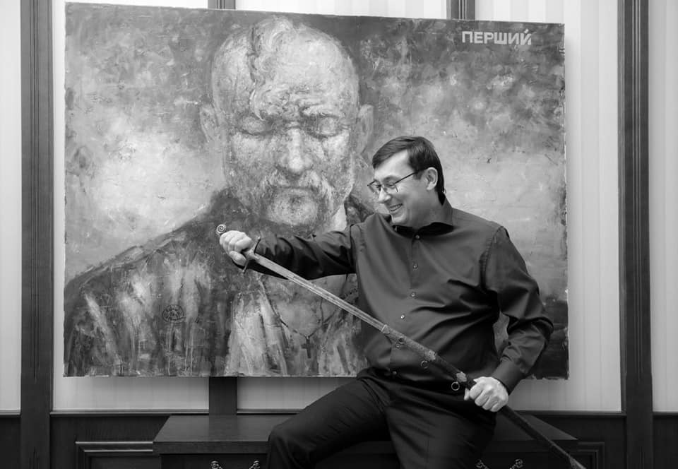 На снимке улыбающийся экс-прокурор запечатлен на фоне портрета казака с оселедцем. Луценко уверенным движением достает из ножен саблю.