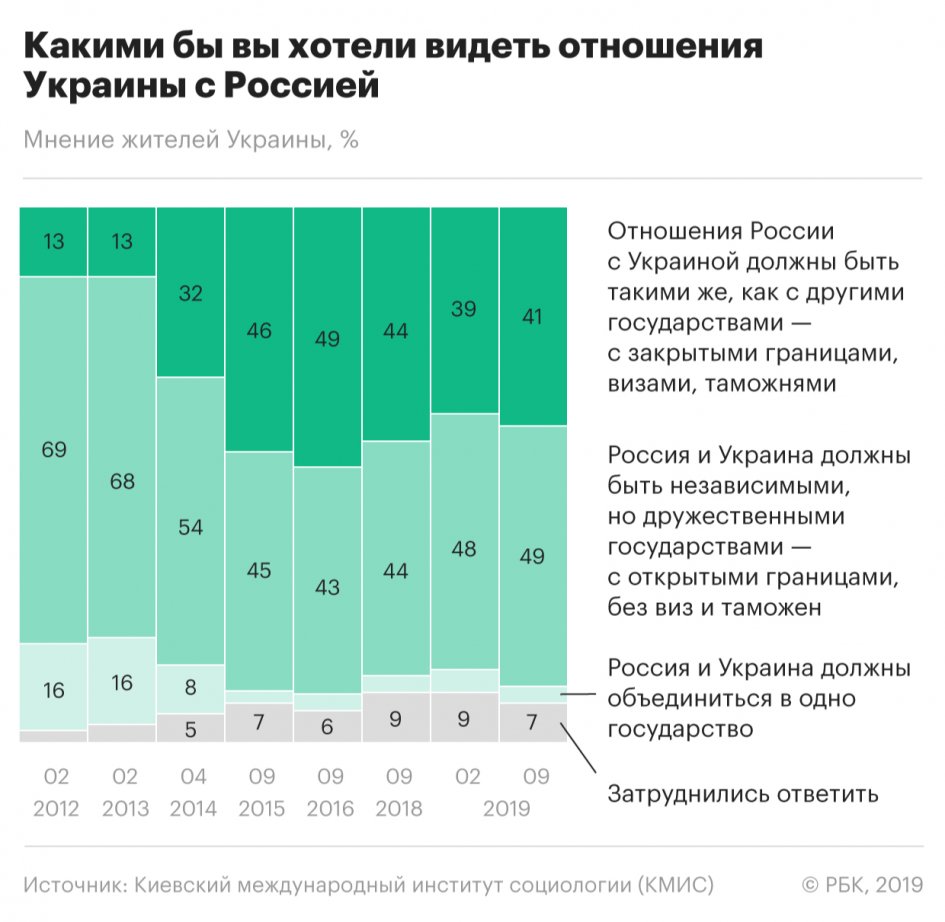 Отношение жителей Украины к России от февраля к сентябрю 2019 года существенно не изменилось. Если в феврале 2019 года хорошо к России относились 57% украинцев (15% очень хорошо и 42% в основном хорошо), то в сентябре - 54% (16% очень хорошо и 38% в основном хорошо).