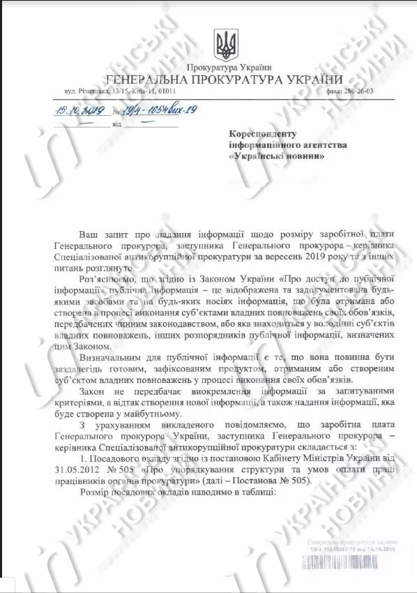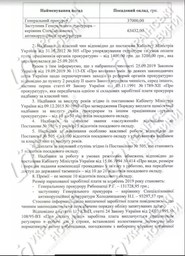 При этом также уточняется, что заместитель генпрокурора - руководитель Специальной антикоррупционной прокуратуры Назар Холодницкий за сентябрь текущего года получил 93 297 гривен.