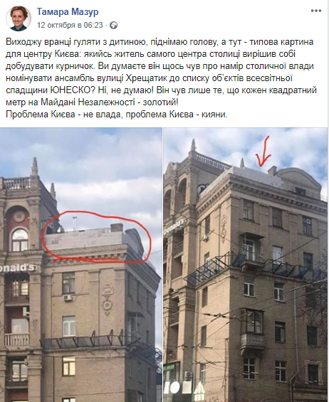 "Выхожу утром гулять с ребенком, поднимаю голову, а здесь - типичная картина для центра Киева: некий житель самого центра столицы решил себе достроить курятничек. Вы думаете, он что-то слышал о намерении столичной власти номинировать ансамбль улицы Крещатик в список объектов всемирного наследия ЮНЕСКО? Нет, не думаю! Он слышал лишь то, что каждый квадратный метр на Майдане Независимости - золотой! Проблема Киева - не власть, проблема Киева - киевляне", - написала в Facebook профессор кафедры публичного управления и администрирования Национальной академии внутренних дел Украины Тамара Мазур и добавила фото.
