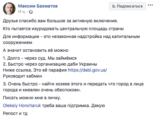 В комментариях к посту Бахматов написал, что незаконную надстройку на крыше жилого дома, в котором расположен ресторан McDonalds и который смотрит на Майдан Независимости, снесут.