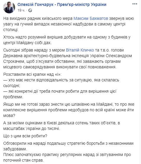 Отчитался о заседании и премьер-министр Алексей Гончарук. 15 октября на официальной странице "Олексій Гончарук - Прем'єр-міністр України" появился пост, в котором говорилось, что "кто-то слишком умный решил достроить на одном из домов в центре Майдана себе крышу".