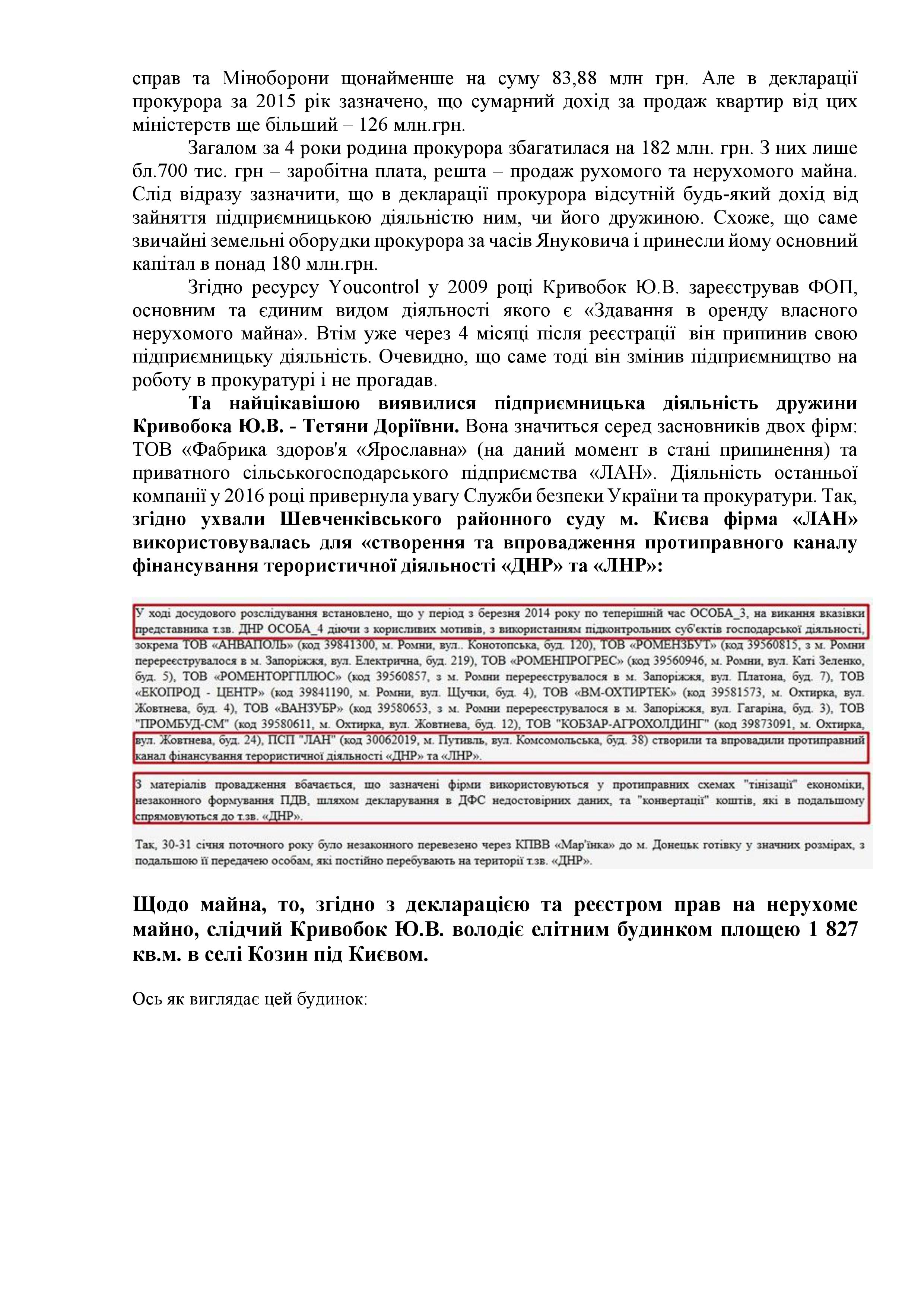 Напомним, Генпрокуратура Украины вызвала бывшего министра юстиции Елену Лукаш, чтобы вручить ей уточненное пследователь Кривобок. Между тем, жена Юрия Кривобока в 2015 году получила 154 млн грн дохода от продажи недвижимого имущества.