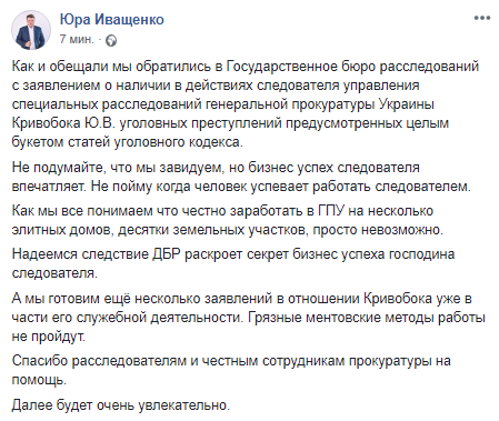 "Не подумайте, что мы завидуем, но бизнес успех следователя впечатляет. Не пойму когда человек успевает работать следователем. Как мы все понимаем, что честно заработать в ГПУ на несколько элитных домов, десятки земельных участков, просто невозможно. Надеемся следствие ГБР раскроет секрет бизнес-успеха господина следователя", - написал Иващенко.