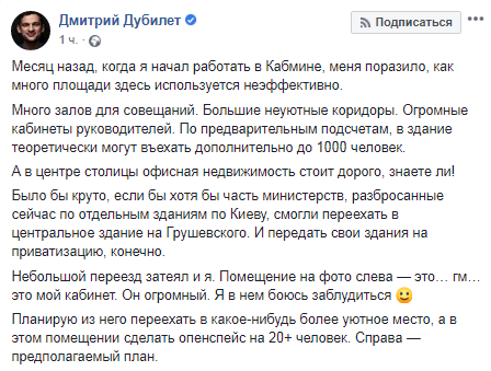 "Месяц назад, когда я начал работать в Кабмине, меня поразило, как много площади здесь используется неэффективно. Много залов для совещаний. Большие неуютные коридоры. Огромные кабинеты руководителей. По предварительным подсчетам, в здание теоретически могут въехать дополнительно до 1000 человек. А в центре столицы офисная недвижимость стоит дорого, знаете ли!", - написал Дубилет.