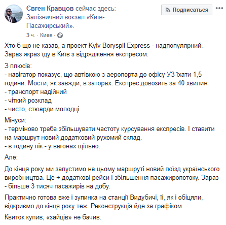 "Укрзализныця" планирует до конца 2019 года запустить новый поезд украинского производства на маршрут Киев - аэропорт "Борисполь". Поезд будет делать остановку на станции Выдубичи. Об этом на своей странице опубликовал, когда ехал в бориспольском экспрессе, возвращаясь из командировки.