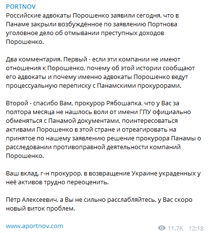 "Второй [комментарий] - спасибо Вам, прокурор Рябошапка, что у Вас за полтора месяца не нашлось воли от имени ГПУ официально обменяться с Панамой документами, поинтересоваться активами Порошенко в этой стране и отреагировать на принятое по нашему заявлению решение прокурора Панамы о расследовании противоправной деятельности компаний Порошенко. Ваш вклад, г-н прокурор, в возвращение Украине украденных у неё активов трудно переоценить", - написал Портнов.